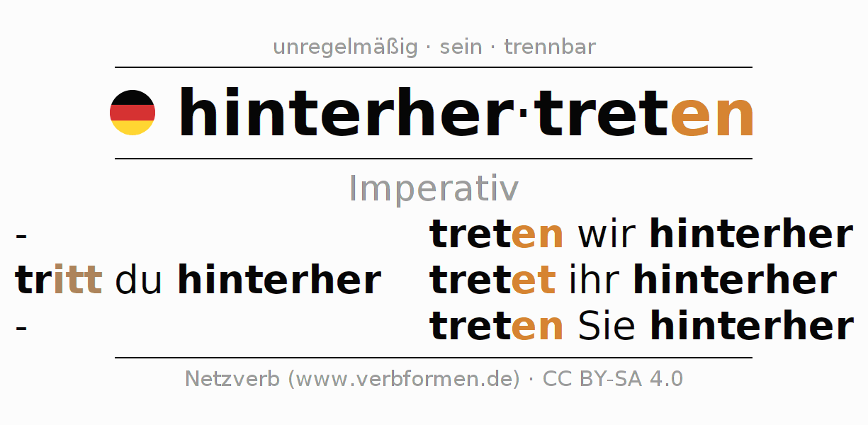 Das Verb hinterhertreten vollständig in allen Personen und Numeri im Imperativ Präsens konjugiert