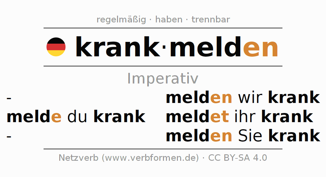 Das Verb krankmelden vollständig in allen Personen und Numeri im Imperativ Präsens konjugiert