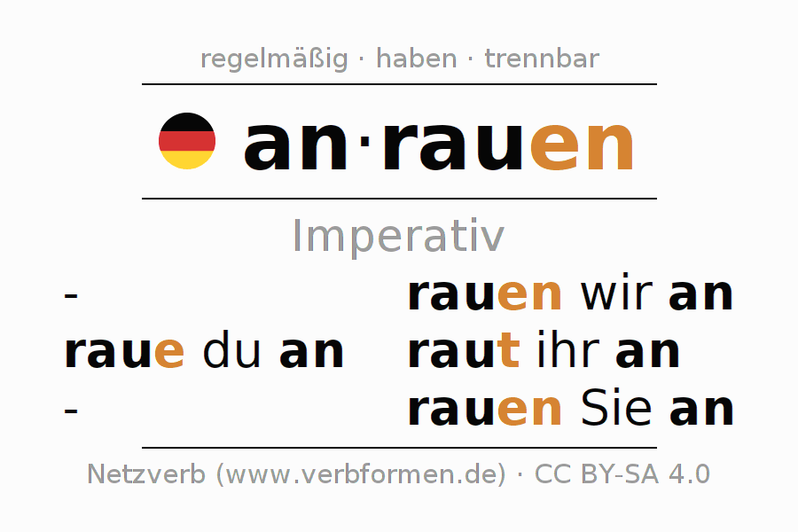 Das Verb anrauen vollständig in allen Personen und Numeri im Imperativ Präsens konjugiert