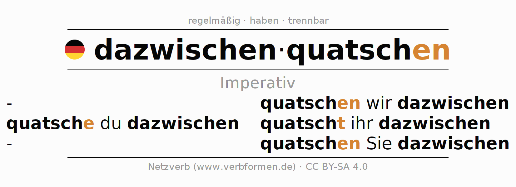 Das Verb dazwischenquatschen vollständig in allen Personen und Numeri im Imperativ Präsens konjugiert