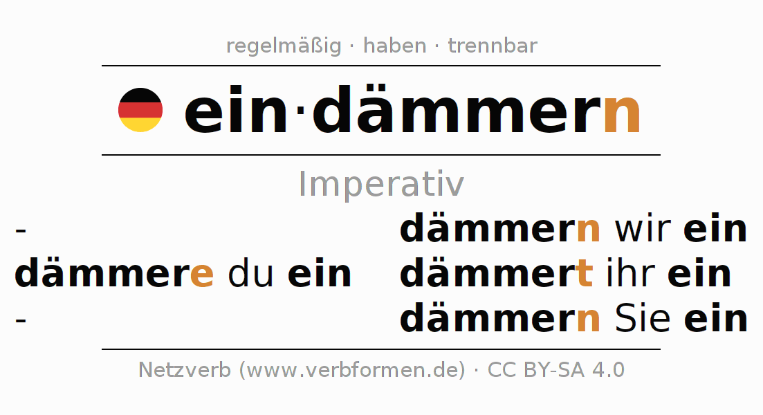 Das Verb eindämmern (hat) vollständig in allen Personen und Numeri im Imperativ Präsens konjugiert