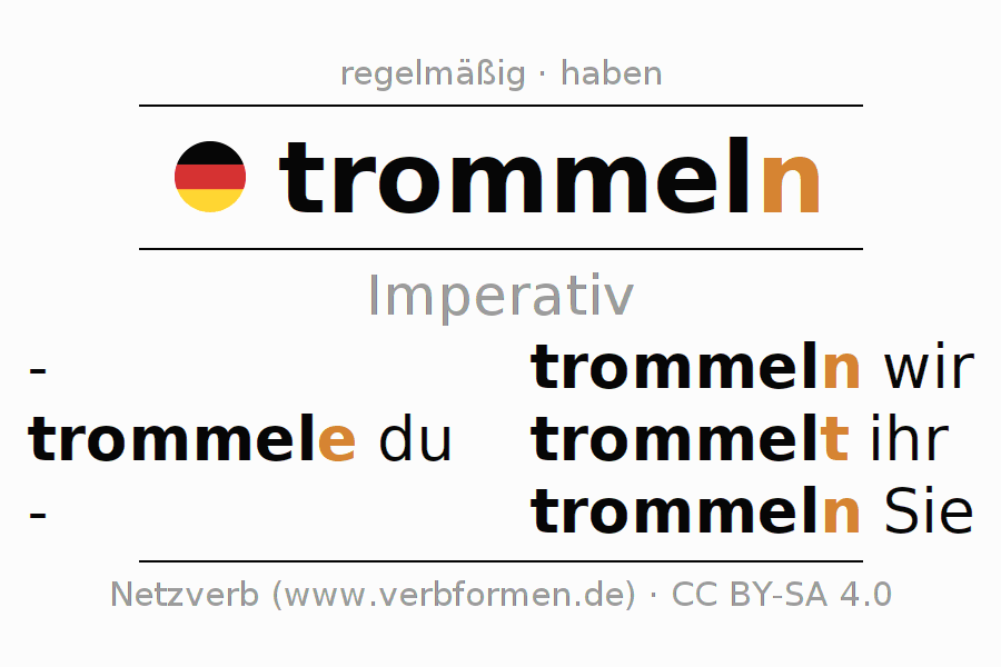 Das Verb trommeln vollständig in allen Personen und Numeri im Imperativ Präsens konjugiert