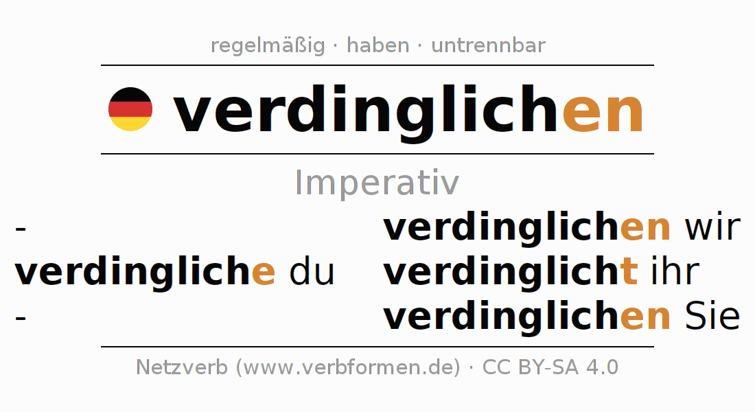 Das Verb verdinglichen vollständig in allen Personen und Numeri im Imperativ Präsens konjugiert