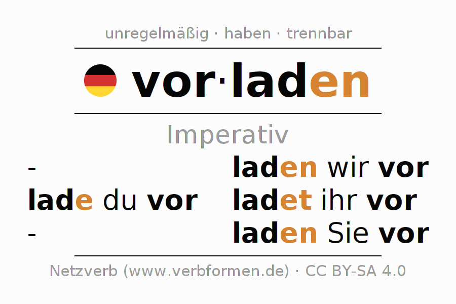 Das Verb vorladen vollständig in allen Personen und Numeri im Imperativ Präsens konjugiert