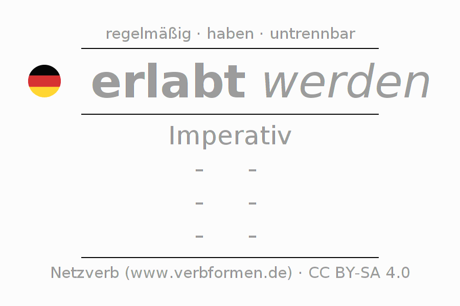 Die Konjugation von erlaben im Imperativ Präsens Befehlsform Vorgangspassiv ist: -, -, -, -.Die Bildung dieser Formen entspricht gewissen grammatischen Regeln. So auch die Vorgaben zur Konjugation der einfachen Verbformen von erlaben im Imperativ. Kommentare ☆