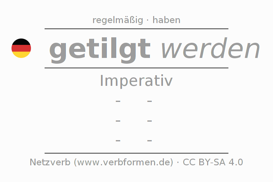 Die Konjugation von tilgen im Imperativ Präsens Befehlsform Vorgangspassiv ist: -, -, -, -.Die Bildung dieser Formen entspricht gewissen grammatischen Regeln. So auch die Vorgaben zur Konjugation der einfachen Verbformen von tilgen im Imperativ. Kommentare ☆
