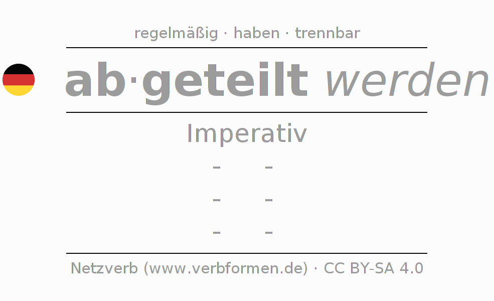 Die Konjugation von abteilen im Imperativ Präsens Befehlsform Vorgangspassiv ist: -, -, -, -.Die Bildung dieser Formen entspricht gewissen grammatischen Regeln. So auch die Vorgaben zur Konjugation der einfachen Verbformen von abteilen im Imperativ. Kommentare ☆