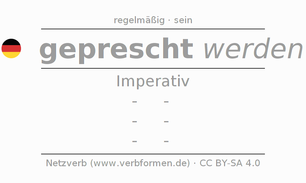 Die Konjugation von preschen im Imperativ Präsens Befehlsform Vorgangspassiv ist: -, -, -, -.Die Bildung dieser Formen entspricht gewissen grammatischen Regeln. So auch die Vorgaben zur Konjugation der einfachen Verbformen von preschen im Imperativ. Kommentare ☆