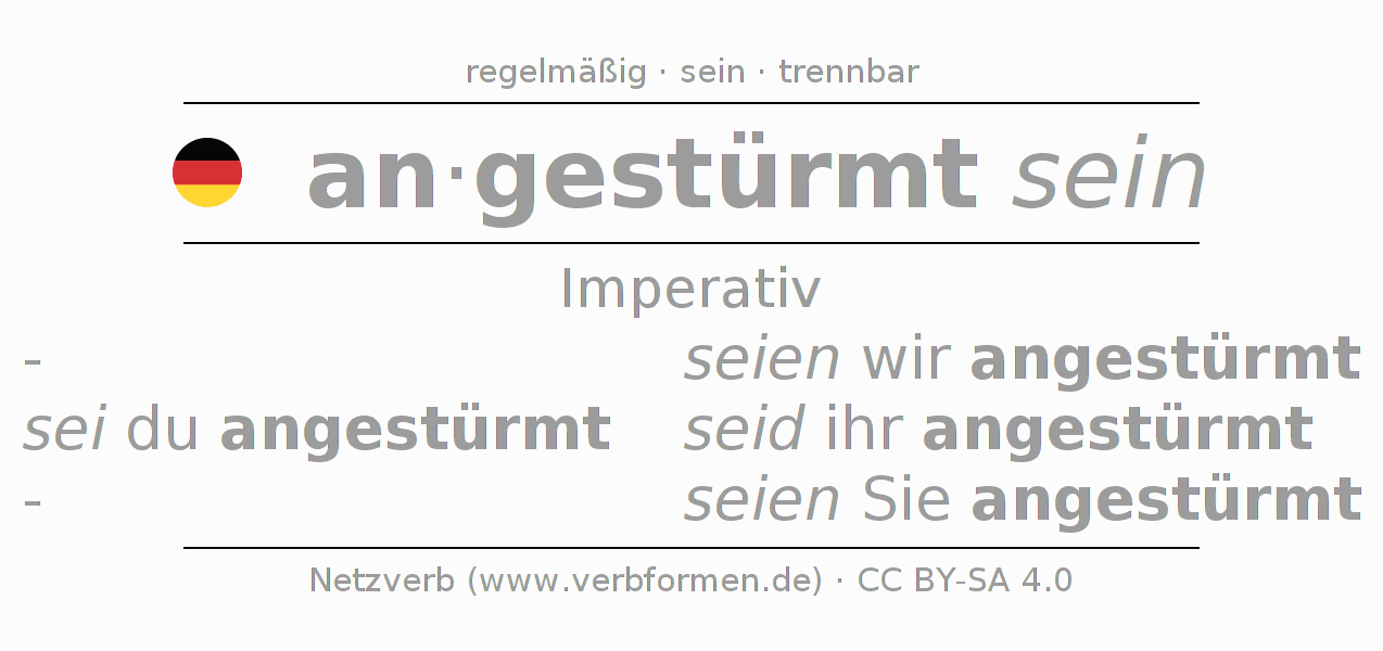 Das Verb anstürmen vollständig in allen Personen und Numeri im Imperativ Präsens konjugiert