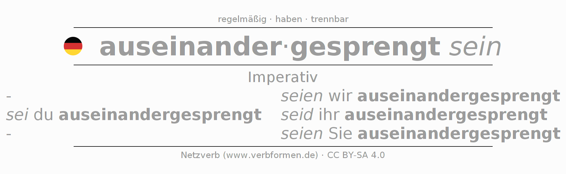 Das Verb auseinandersprengen (hat) vollständig in allen Personen und Numeri im Imperativ Präsens konjugiert