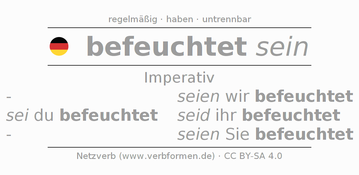 Das Verb befeuchten vollständig in allen Personen und Numeri im Imperativ Präsens konjugiert