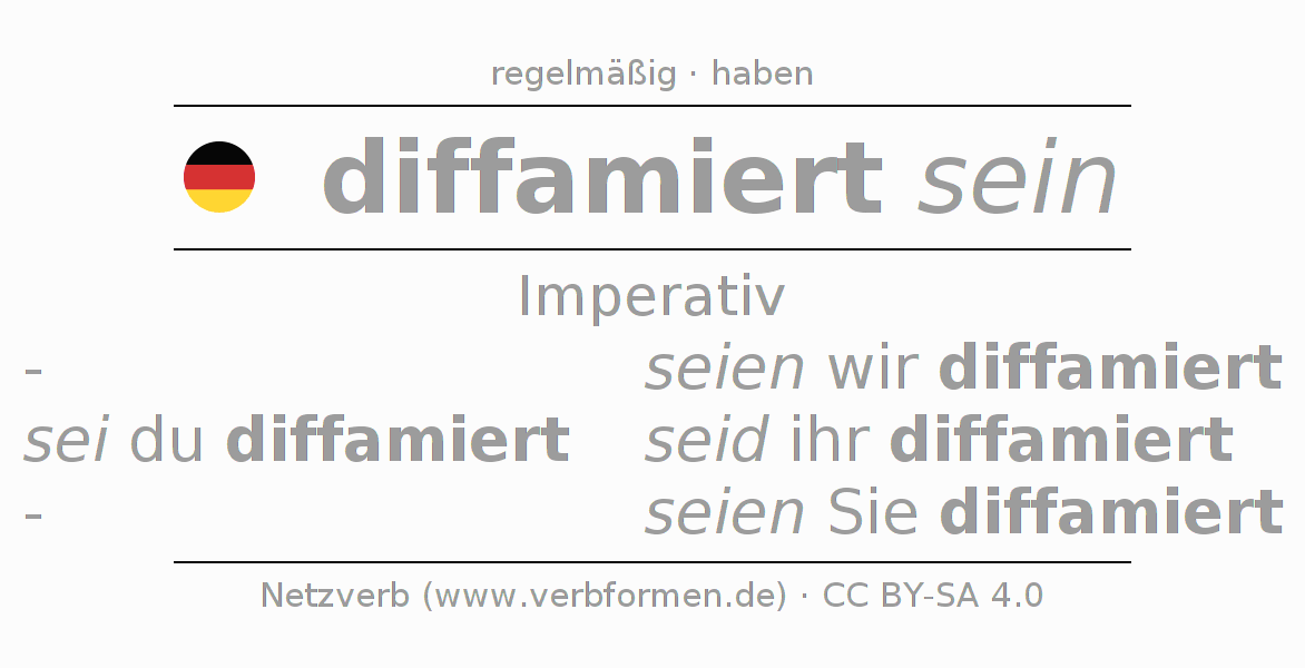 Das Verb diffamieren vollständig in allen Personen und Numeri im Imperativ Präsens konjugiert