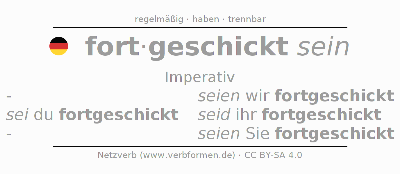Die Konjugation von fortschicken im Imperativ Präsens Befehlsform Zustandspassiv ist: sei (du) fortgeschickt, seien wir fortgeschickt, seid (ihr) fortgeschickt, seien Sie fortgeschickt.Die Bildung dieser Formen entspricht gewissen grammatischen Regeln. So auch die Vorgaben zur Konjugation der einfachen Verbformen von fortschicken im Imperativ. Kommentare ☆