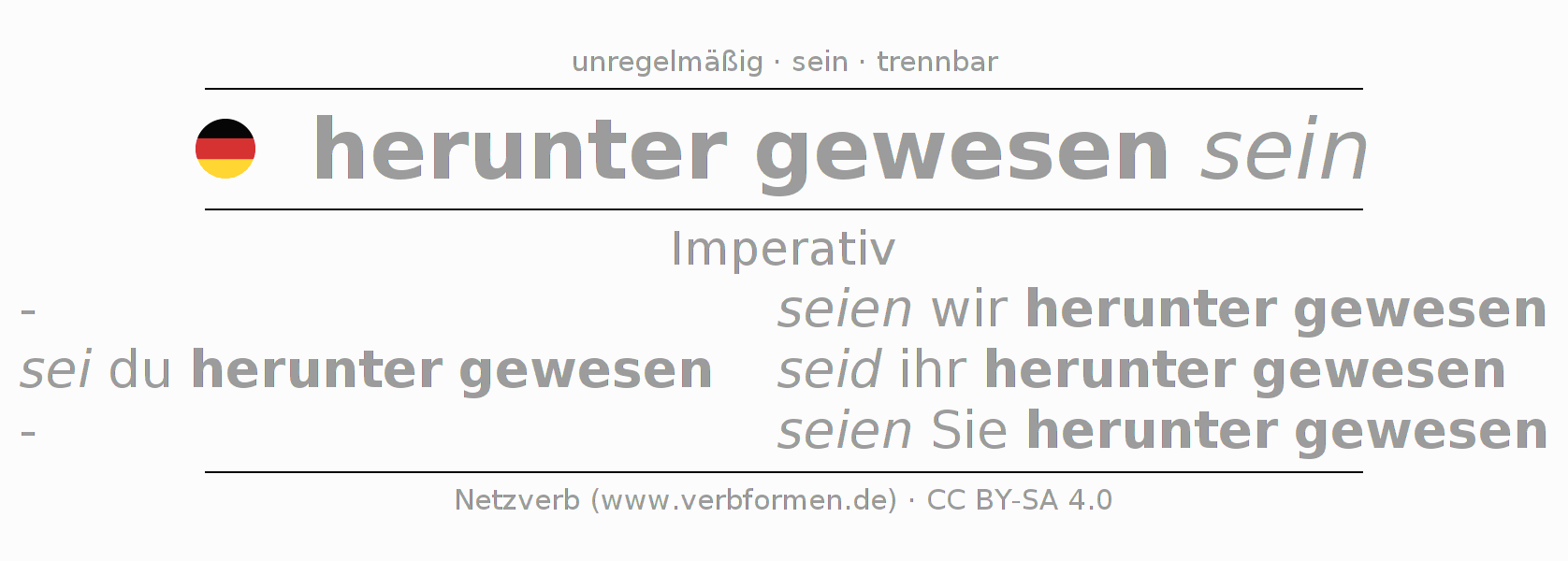 Das Verb heruntersein vollständig in allen Personen und Numeri im Imperativ Präsens konjugiert