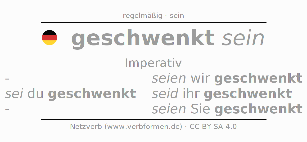 Die Konjugation von schwenken im Imperativ Präsens Befehlsform Zustandspassiv ist: sei (du) geschwenkt, seien wir geschwenkt, seid (ihr) geschwenkt, seien Sie geschwenkt.Die Bildung dieser Formen entspricht gewissen grammatischen Regeln. So auch die Vorgaben zur Konjugation der einfachen Verbformen von schwenken im Imperativ. Kommentare ☆