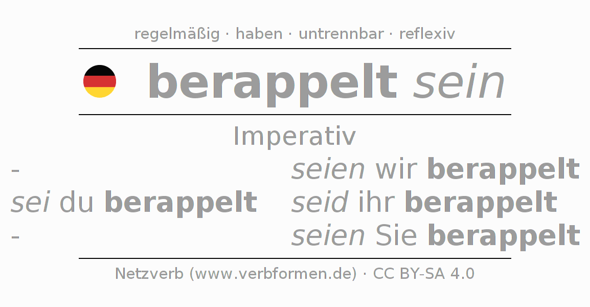 Die Konjugation von sich berappeln im Imperativ Präsens Befehlsform Zustandspassiv ist: sei (du) berappelt, seien wir berappelt, seid (ihr) berappelt, seien Sie berappelt.Die Bildung dieser Formen entspricht gewissen grammatischen Regeln. So auch die Vorgaben zur Konjugation der einfachen Verbformen von berappeln im Imperativ. Kommentare ☆