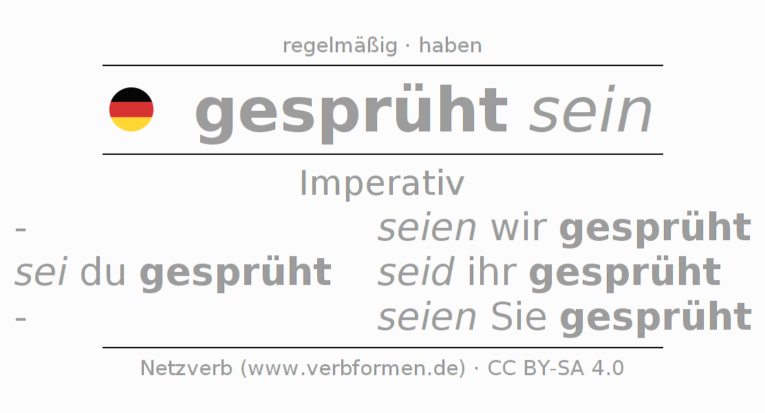 Das Verb sprühen (hat) vollständig in allen Personen und Numeri im Imperativ Präsens konjugiert