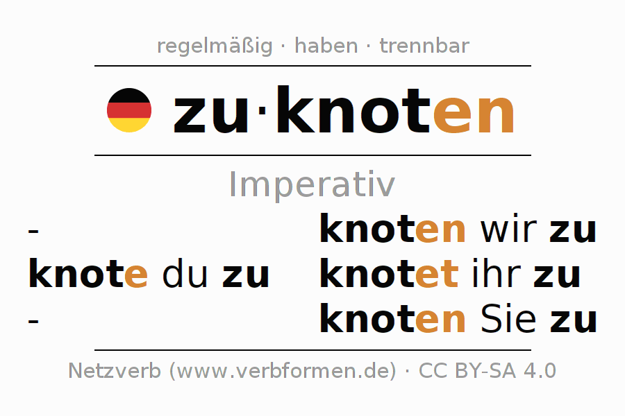 Das Verb zuknoten vollständig in allen Personen und Numeri im Imperativ Präsens konjugiert
