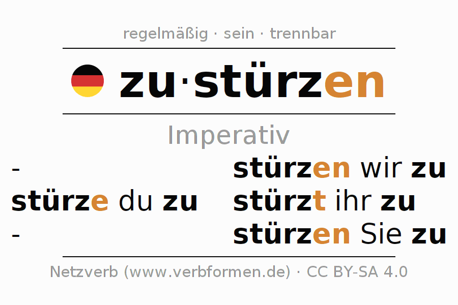 Das Verb zustürzen vollständig in allen Personen und Numeri im Imperativ Präsens konjugiert