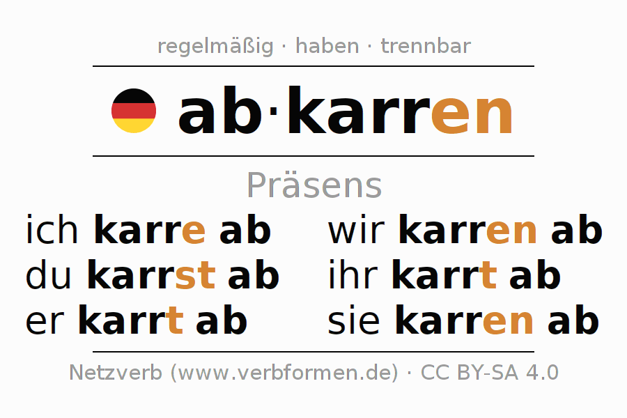 Das Verb abkarren vollständig in allen Personen und Numeri im Präsens Indikativ konjugiert