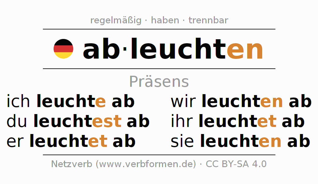 Das Verb ableuchten vollständig in allen Personen und Numeri im Präsens Indikativ konjugiert