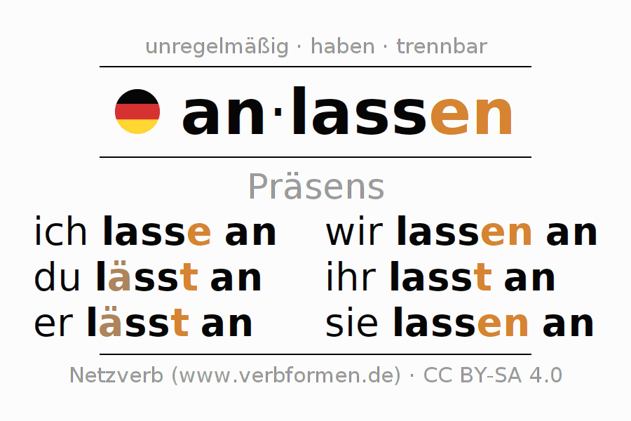 Das Verb anlassen vollständig in allen Personen und Numeri im Präsens Indikativ konjugiert