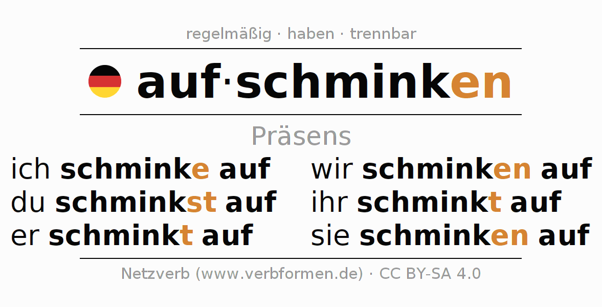 Das Verb aufschminken vollständig in allen Personen und Numeri im Präsens Indikativ konjugiert