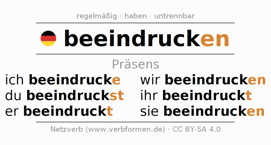 Das Verb beeindrucken vollständig in allen Personen und Numeri im Präsens Indikativ konjugiert