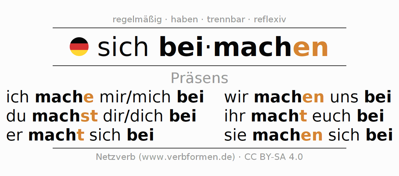 Das Verb sich beimachen vollständig in allen Personen und Numeri im Präsens Indikativ konjugiert