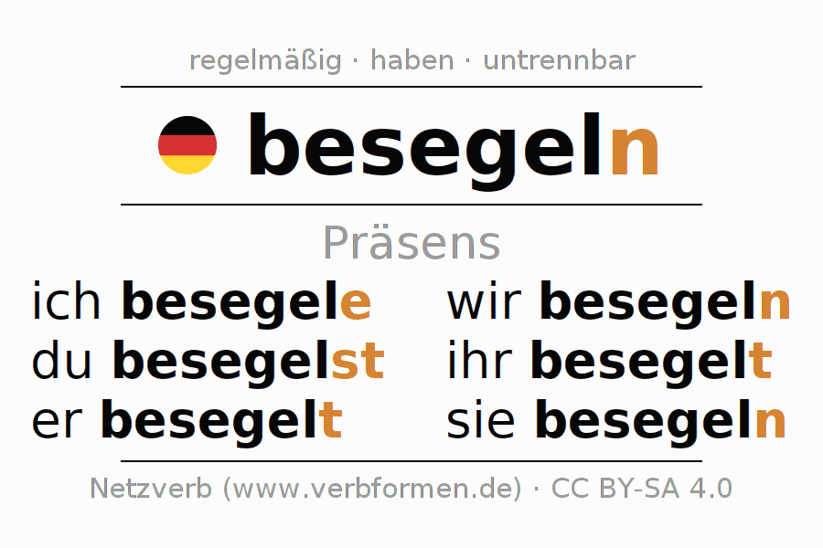 Das Verb besegeln vollständig in allen Personen und Numeri im Präsens Indikativ konjugiert