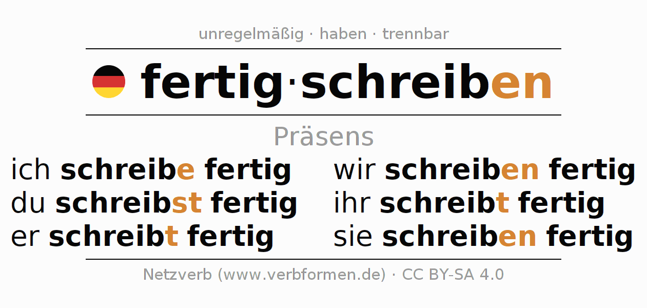 Das Verb fertigschreiben vollständig in allen Personen und Numeri im Präsens Indikativ konjugiert