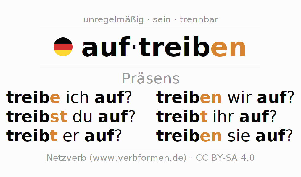 Die Konjugation von auftreiben im Präsens Indikativ Gegenwart Aktiv ist: treibe ich auf?, treibst du auf?, treibt er auf?, treiben wir auf?, treibt ihr auf?, treiben sie auf?.Die Bildung dieser Formen entspricht gewissen grammatischen Regeln. So auch die Vorgaben zur Konjugation der einfachen Verbformen von auftreiben im Präsens. Kommentare ☆