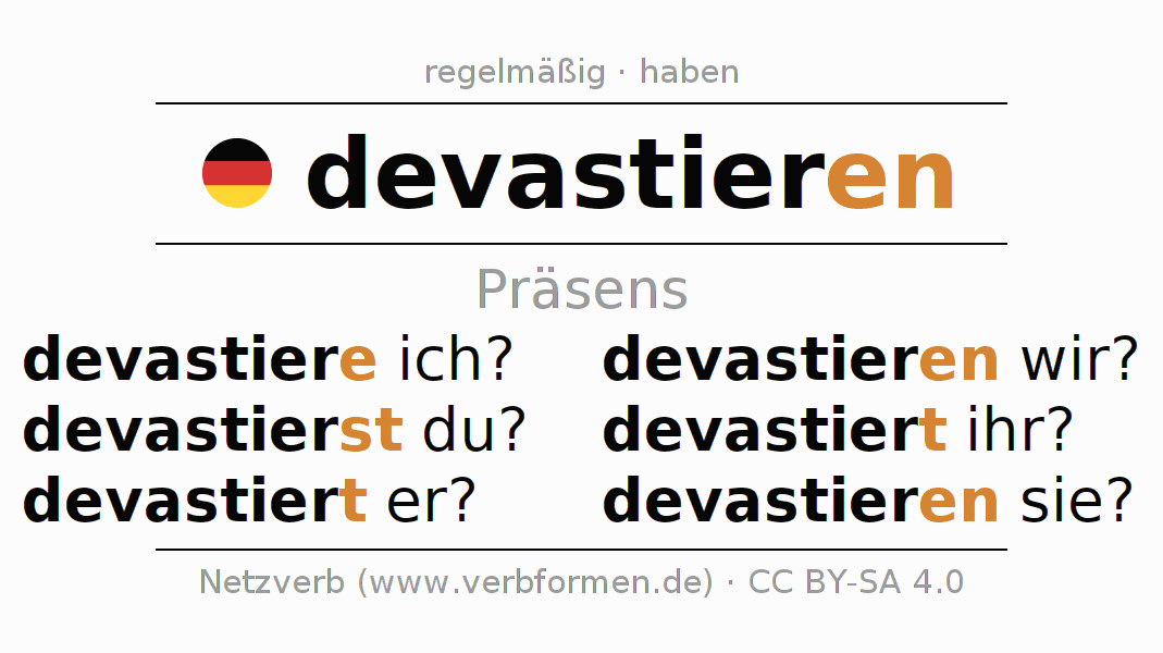 Das Verb devastieren vollständig in allen Personen und Numeri im Präsens Indikativ konjugiert