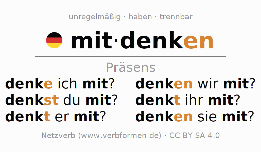 Das Verb mitdenken vollständig in allen Personen und Numeri im Präsens Indikativ konjugiert