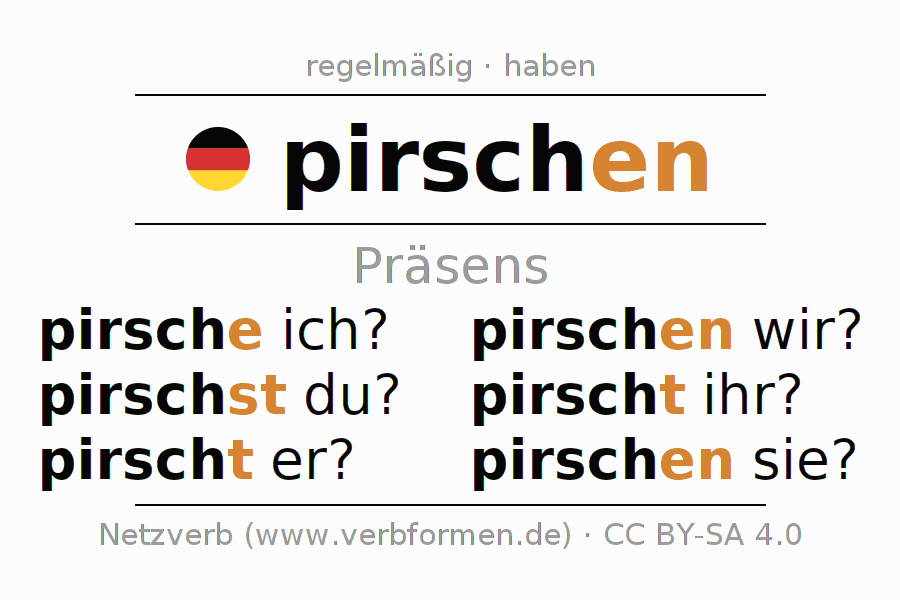 Das Verb pirschen (hat) vollständig in allen Personen und Numeri im Präsens Indikativ konjugiert