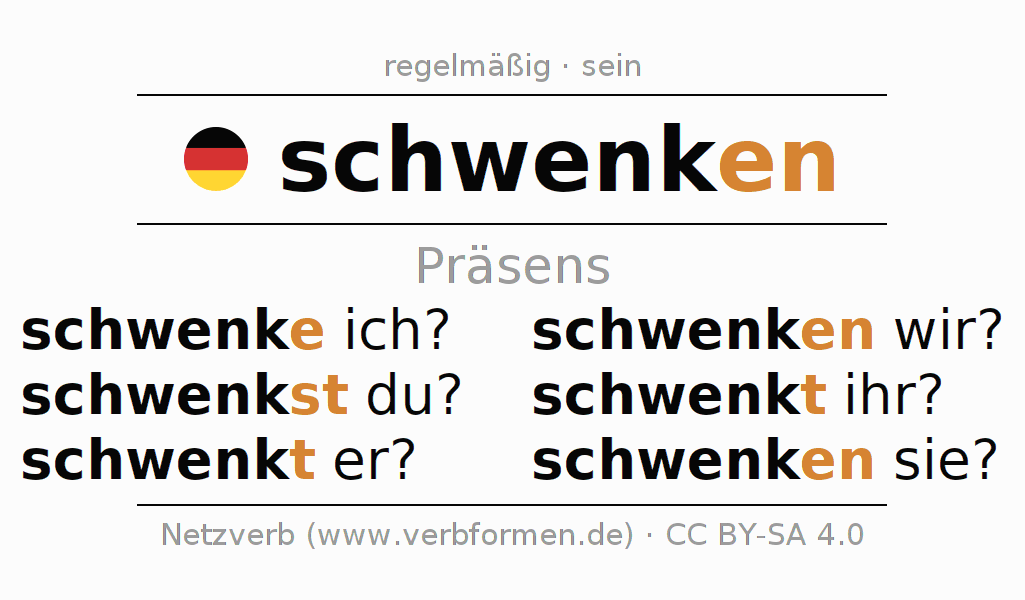 Das Verb schwenken (ist) vollständig in allen Personen und Numeri im Präsens Indikativ konjugiert