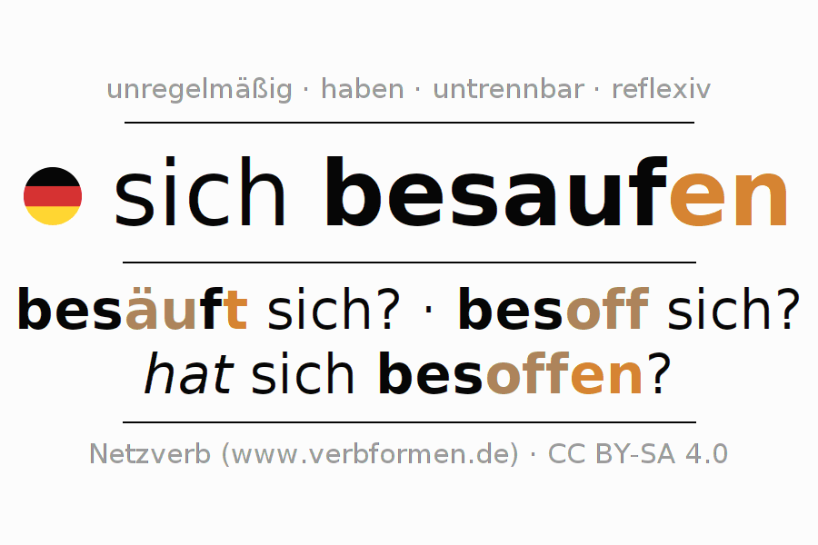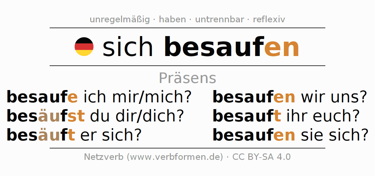 Das Verb sich besaufen vollständig in allen Personen und Numeri im Präsens Indikativ konjugiert