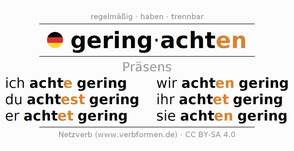 Das Verb geringachten vollständig in allen Personen und Numeri im Präsens Indikativ konjugiert