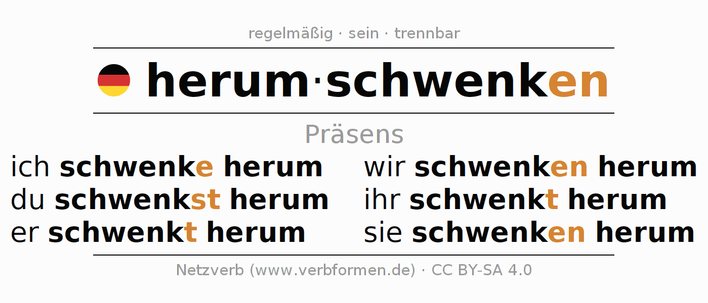 Das Verb herumschwenken (ist) vollständig in allen Personen und Numeri im Präsens Indikativ konjugiert