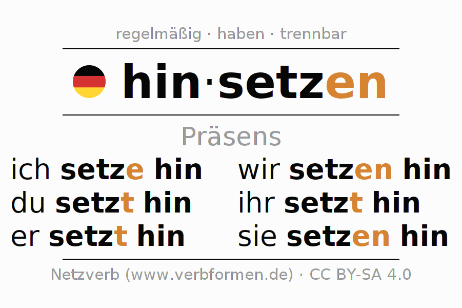 Das Verb hinsetzen vollständig in allen Personen und Numeri im Präsens Indikativ konjugiert