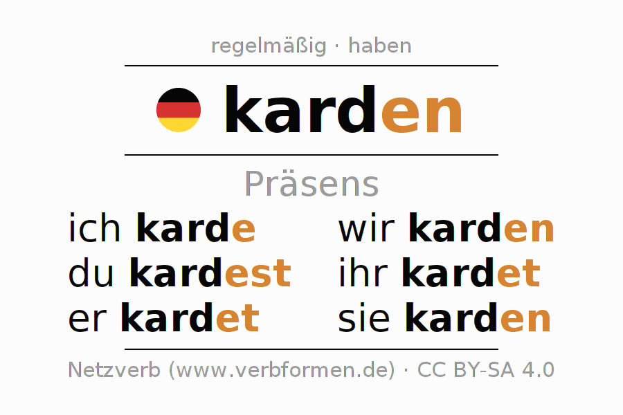 Das Verb karden vollständig in allen Personen und Numeri im Präsens Indikativ konjugiert