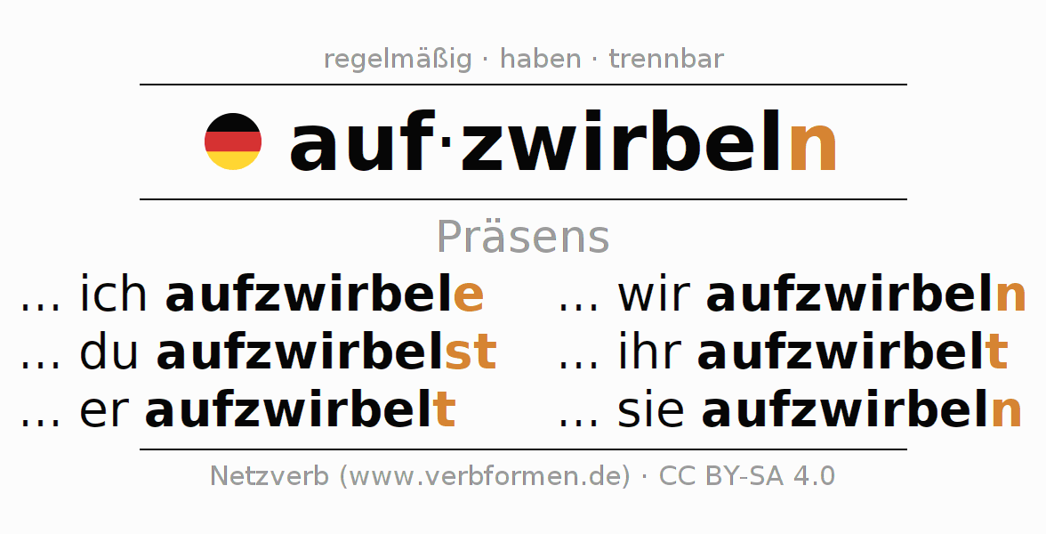 Das Verb aufzwirbeln vollständig in allen Personen und Numeri im Präsens Indikativ konjugiert