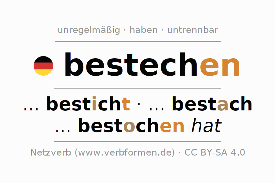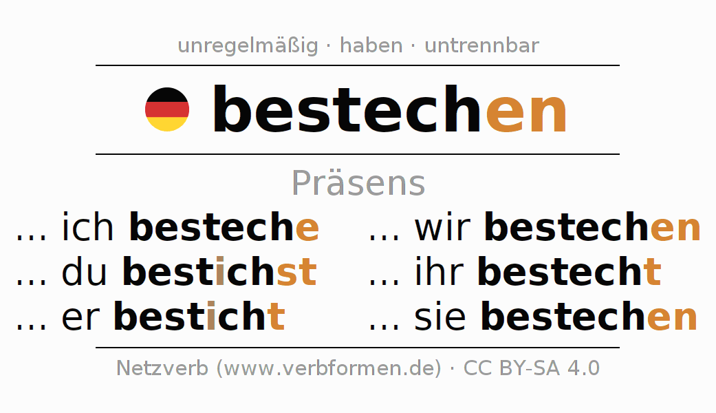 Das Verb bestechen vollständig in allen Personen und Numeri im Präsens Indikativ konjugiert