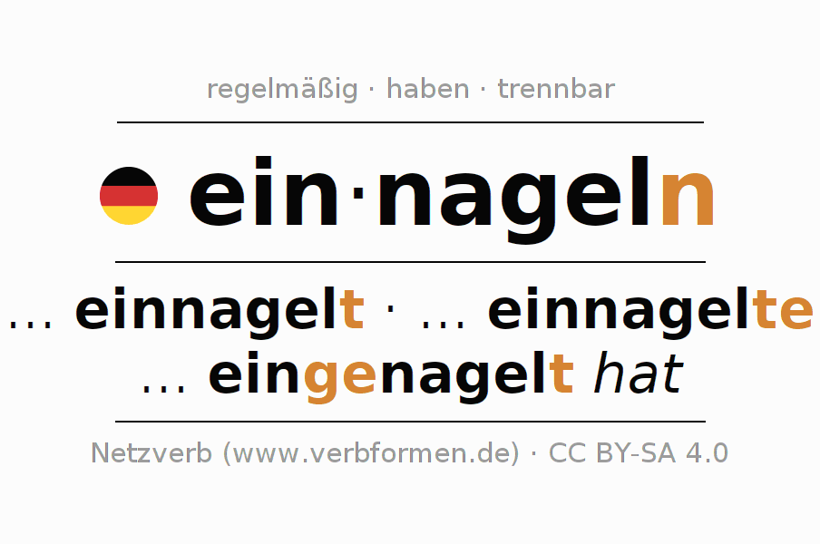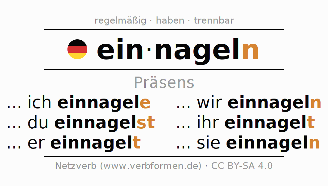 Das Verb einnageln vollständig in allen Personen und Numeri im Präsens Indikativ konjugiert