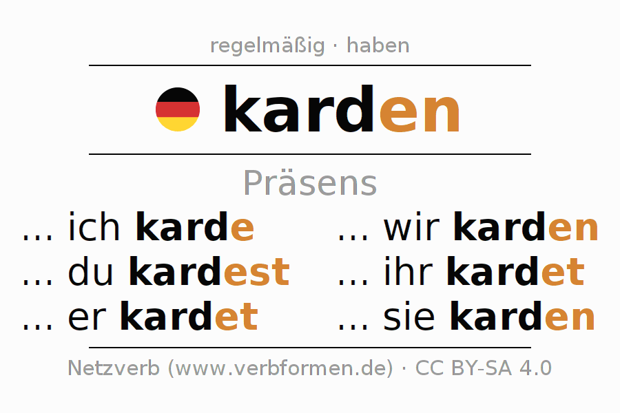 Das Verb karden vollständig in allen Personen und Numeri im Präsens Indikativ konjugiert