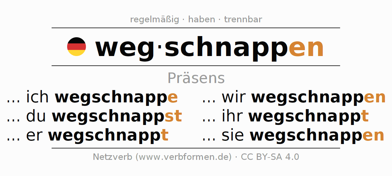 Das Verb wegschnappen vollständig in allen Personen und Numeri im Präsens Indikativ konjugiert