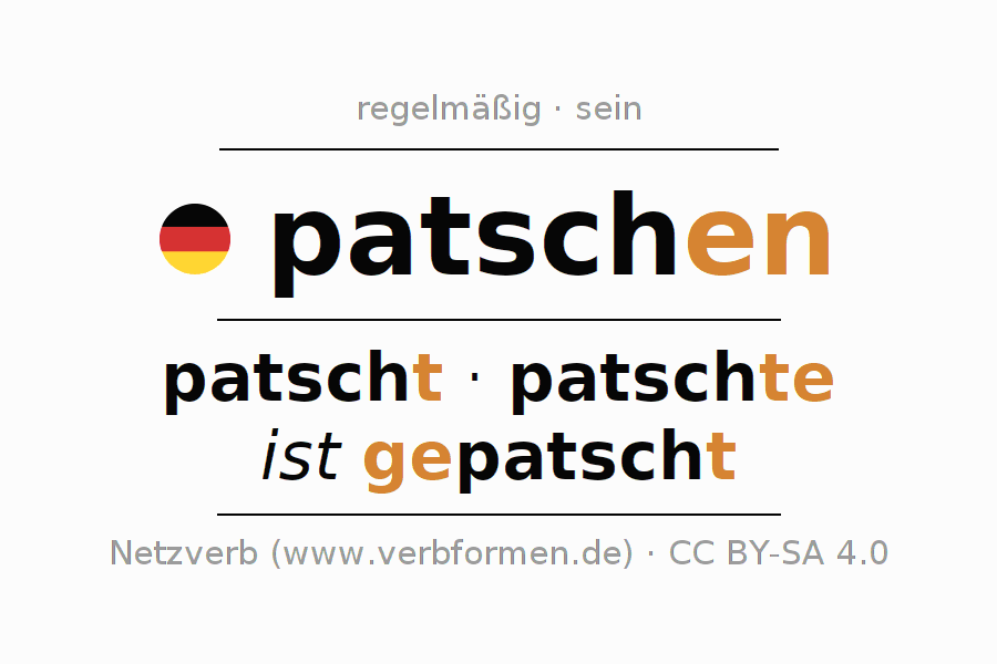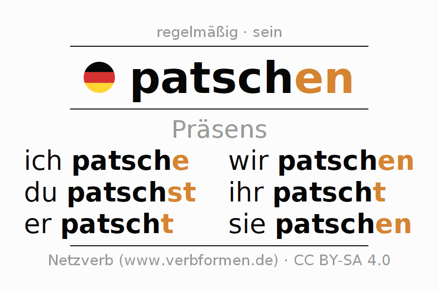 Das Verb patschen (ist) vollständig in allen Personen und Numeri im Präsens Indikativ konjugiert