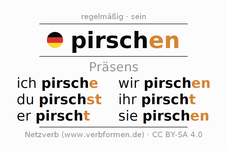 Das Verb pirschen (ist) vollständig in allen Personen und Numeri im Präsens Indikativ konjugiert
