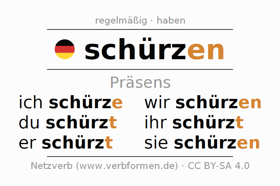 Das Verb schürzen vollständig in allen Personen und Numeri im Präsens Indikativ konjugiert