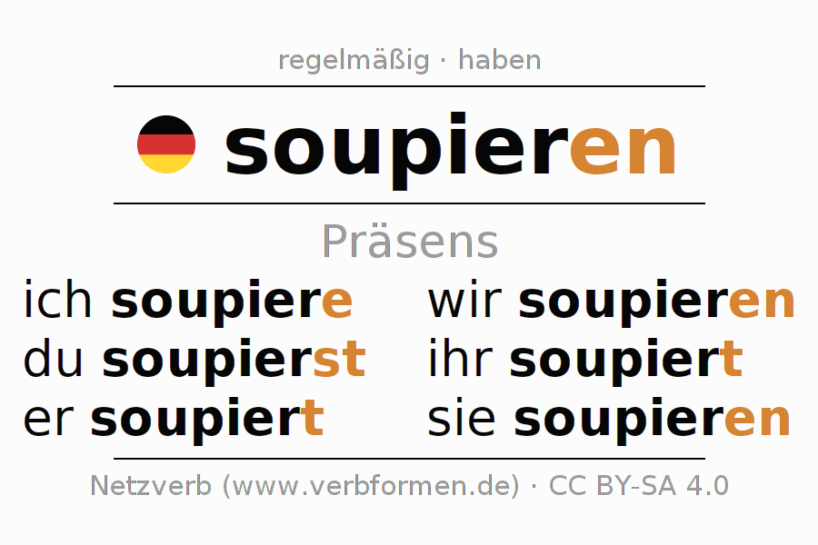Das Verb soupieren vollständig in allen Personen und Numeri im Präsens Indikativ konjugiert